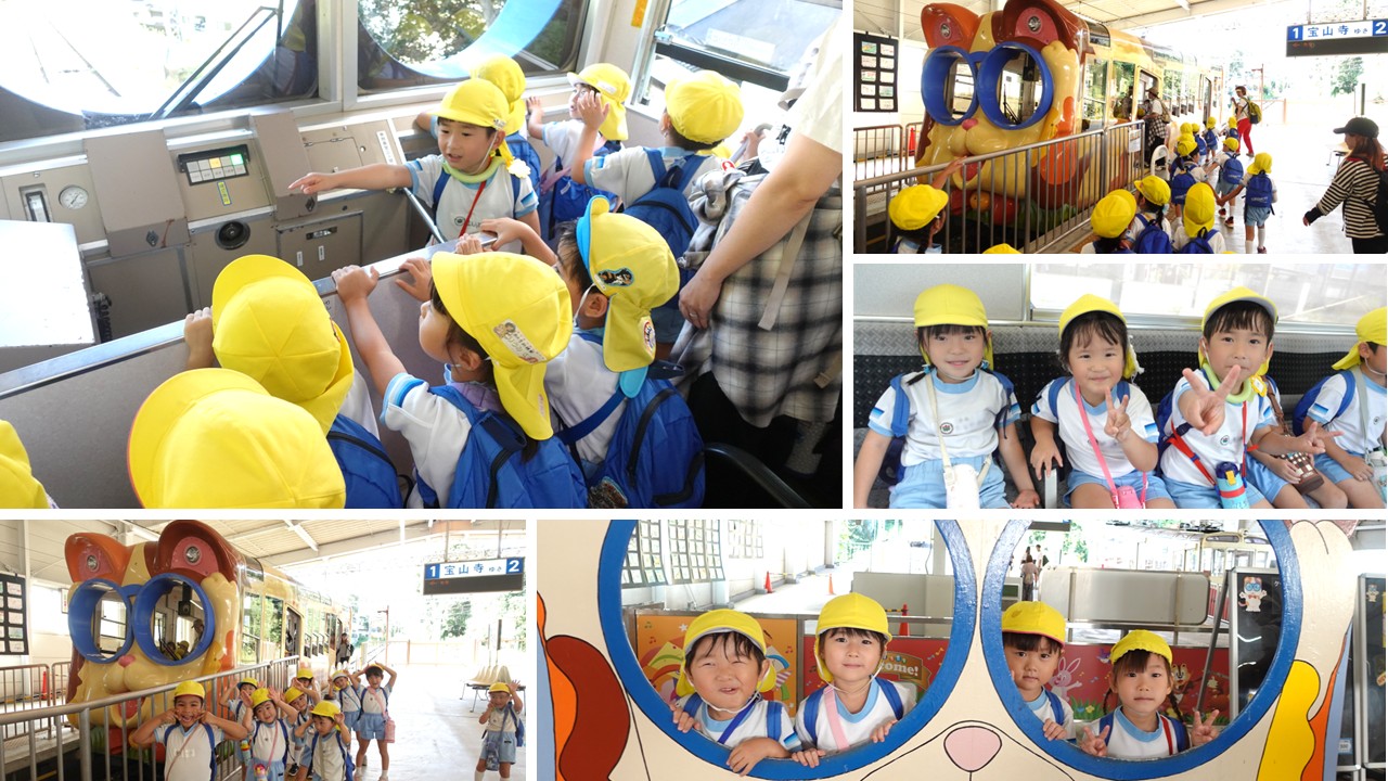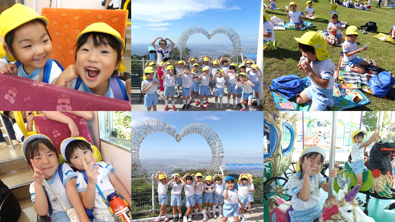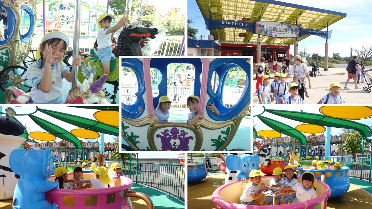 年中児が秋の遠足に行きました。電車に乗って遊園地に出掛けました。「お家の人と来たことがある。」と