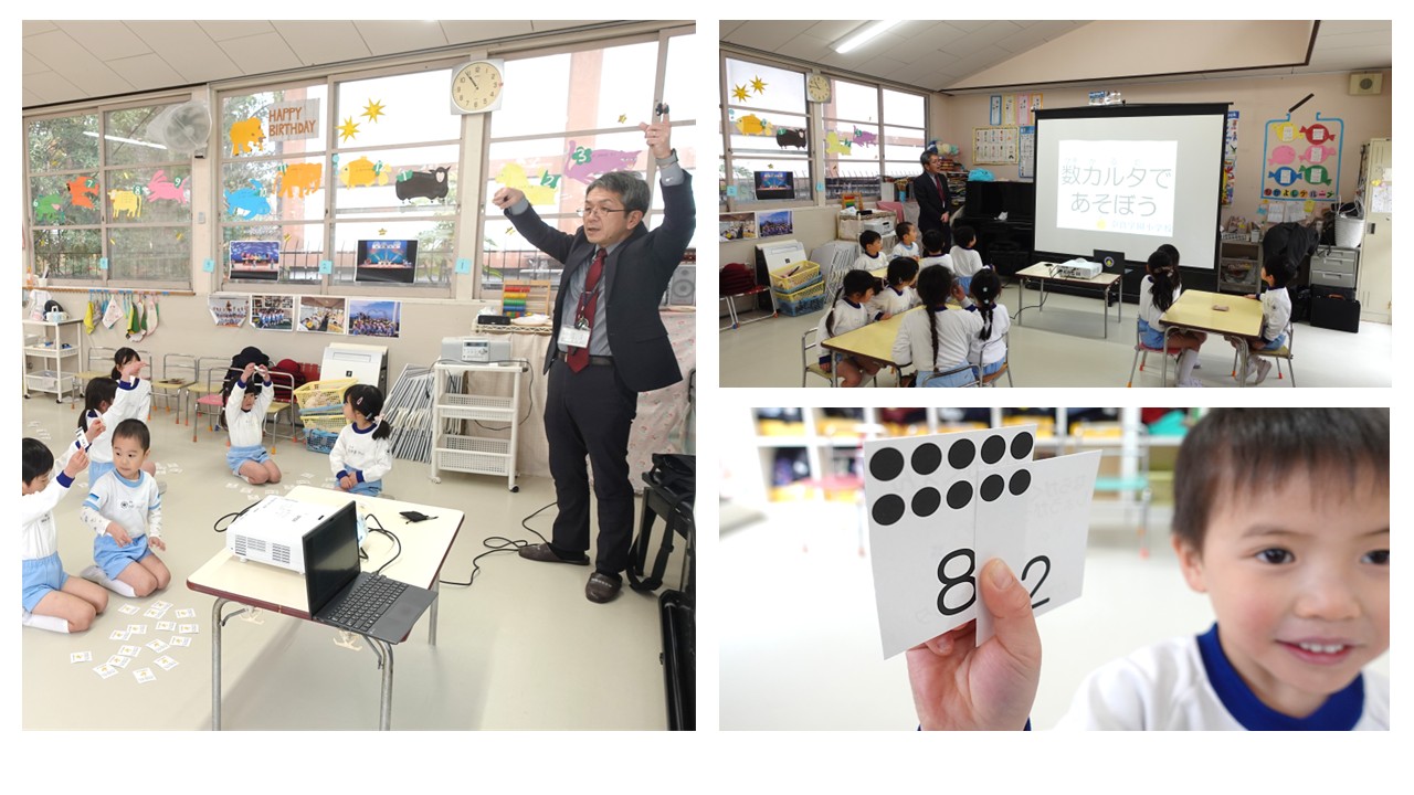 お友だちも学校の先生と会って興味津々。オリジナル教材の数字カルタを使用して、年長児になる